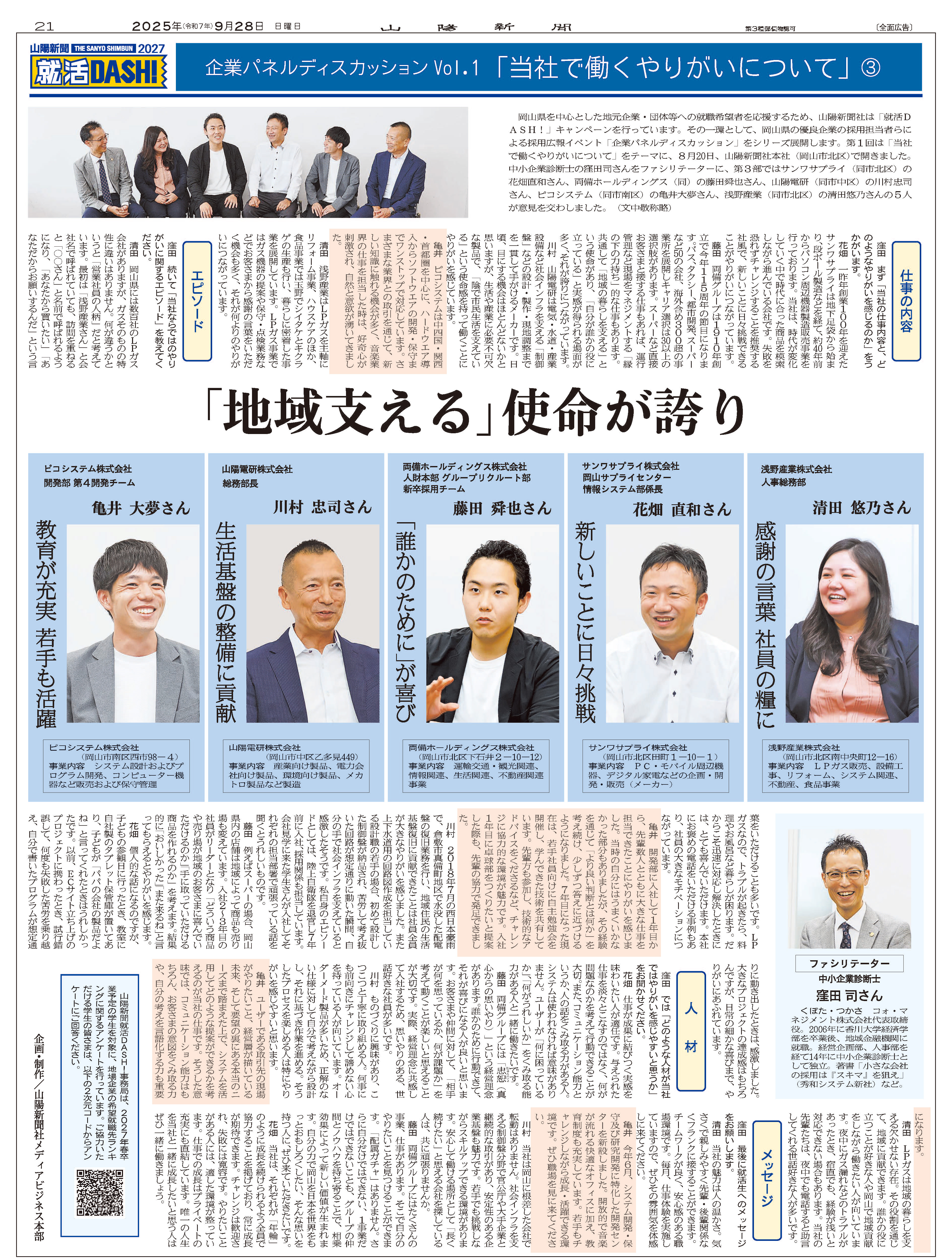 岡山県を中心とした地元企業・団体等への就職希望者を応援するため、山陽新聞社は「就活DASH!」キャンペーンを行っています。その一環として、岡山県の優良企業の採用担当者らによる採用広報イベント「企業パネルディスカッション」をシリーズ展開します。第1回は「当社で働くやりがいについて」をテーマに、8月20日、山陽新聞社本社(岡山市北区)で開きました。