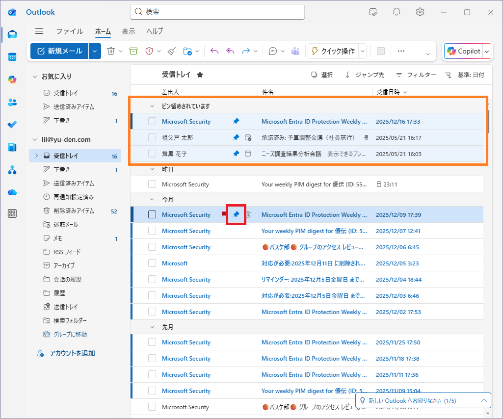 1.重要な任意のメールで[ 📌 ]を選択2.メールウィンドウの先頭[ピン留めされています]カテゴリーへ追加されたことを確認