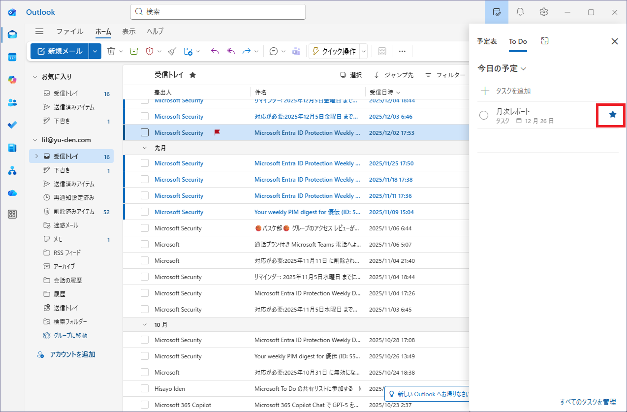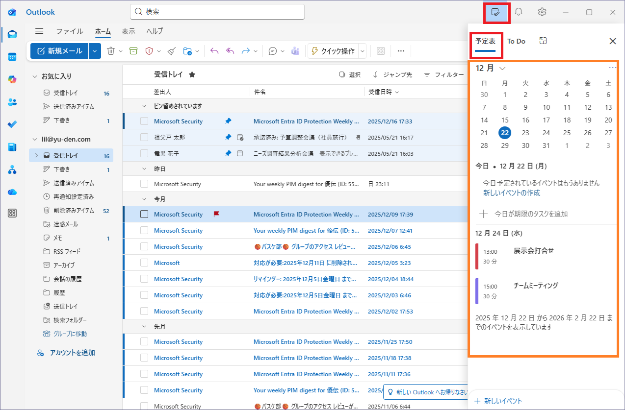 ■Outlookのメール画面で予定表とタスクを一緒に表示する