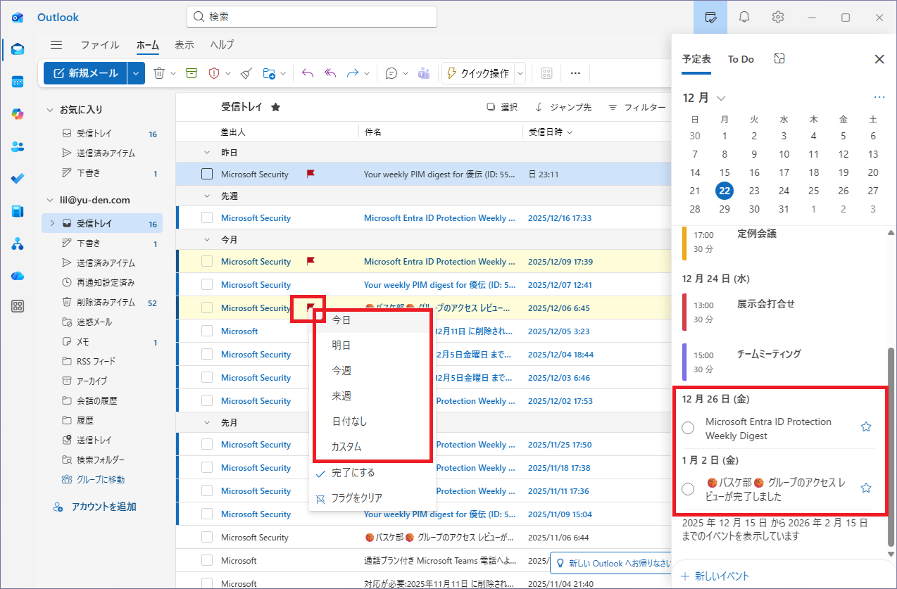 1.任意のメールでフラグアイコンを右クリック2. 任意の期限を設定