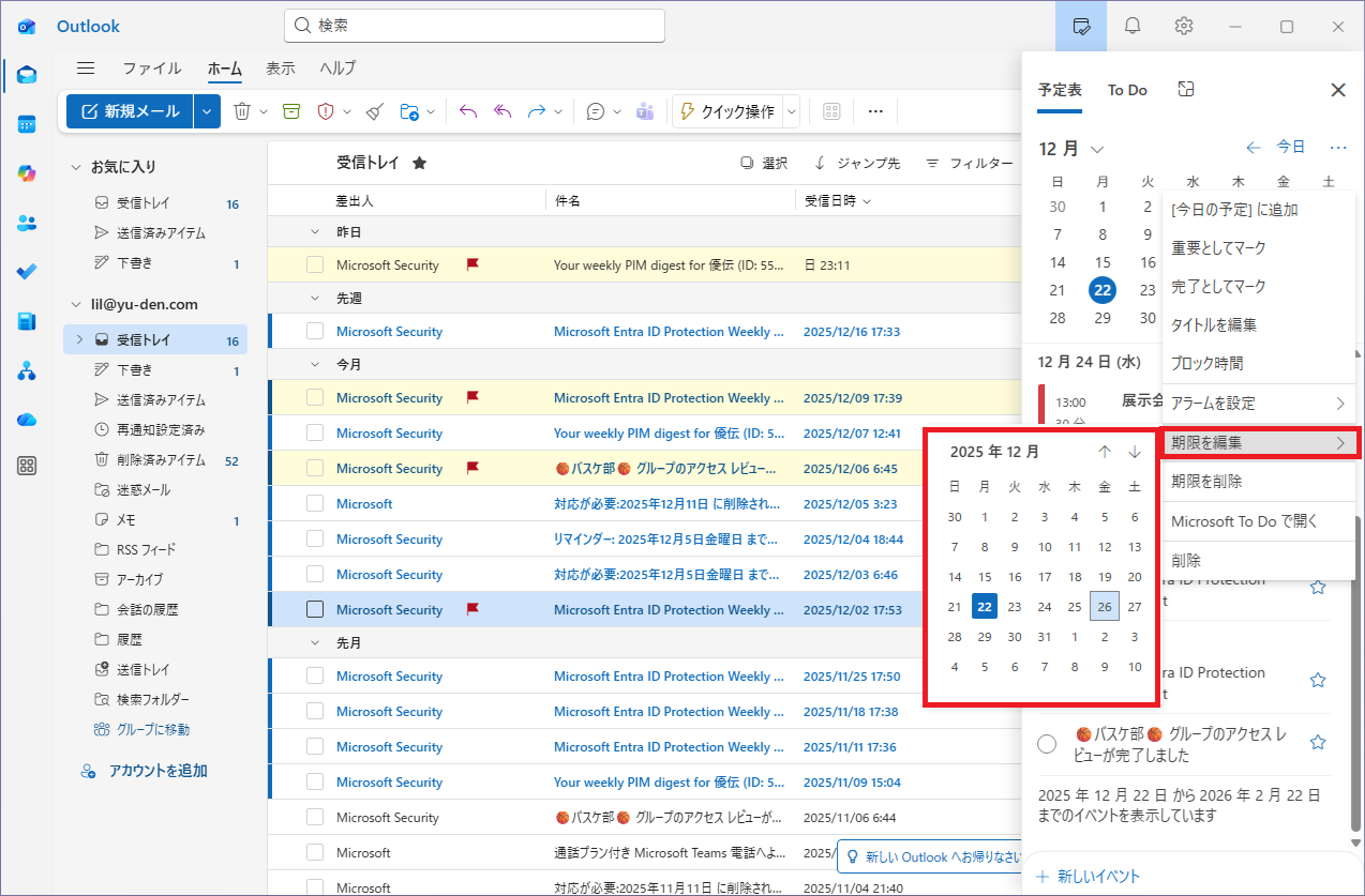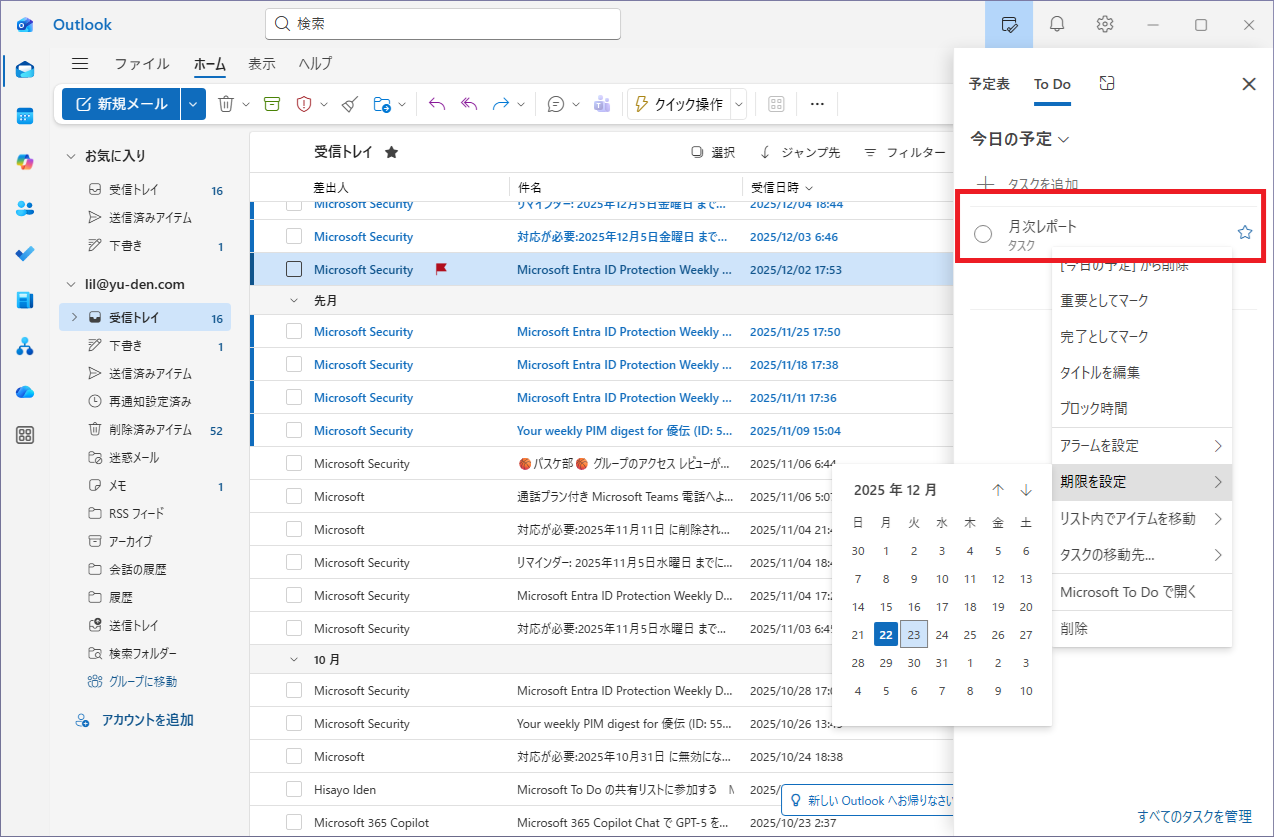 1.[今日の予定]ウィンドウで任意のToDoアイテムを右クリック2.[期限を編集]