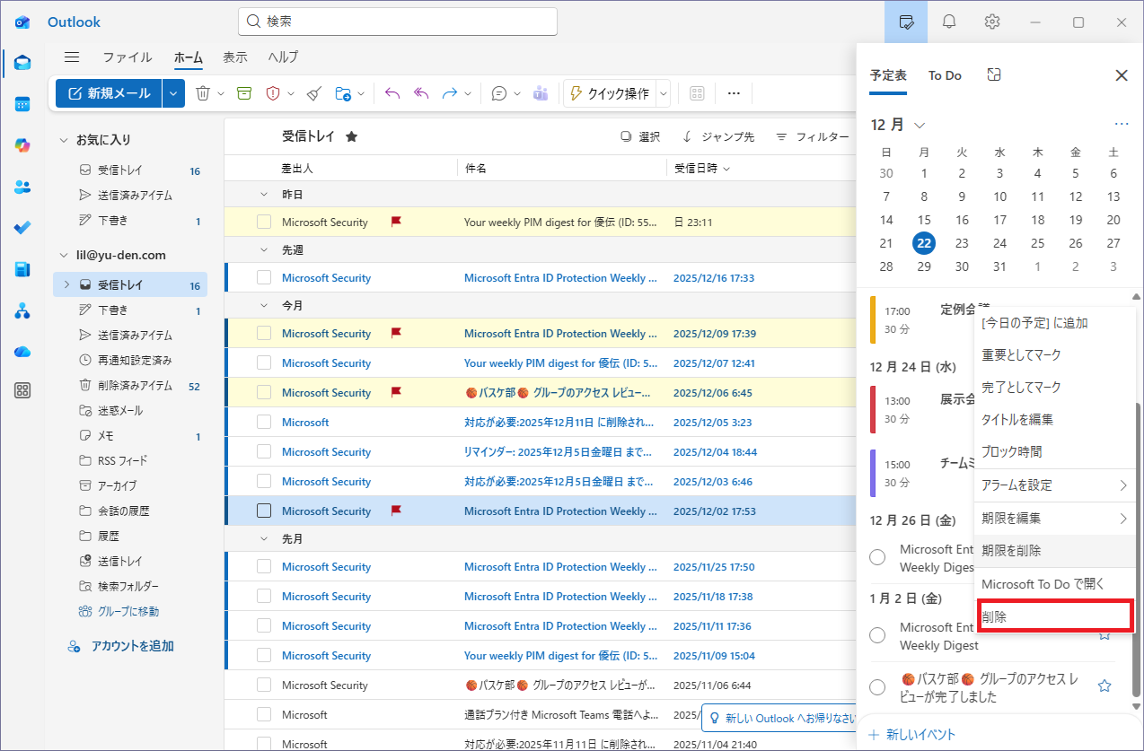 1.[今日の予定]ウィンドウで任意のToDoアイテムを右クリック2.[期限を削除]