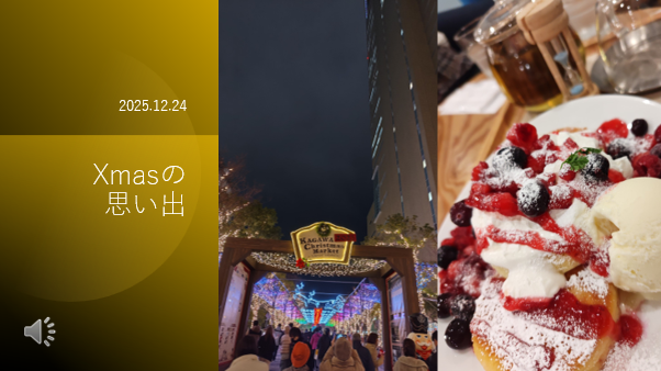 今回の完成目標スライドはこちら。用意したのは画像を2枚と音楽ファイルを1つです。