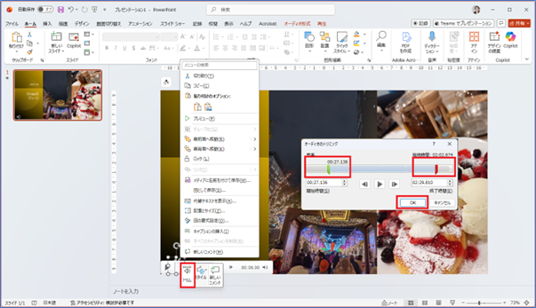 3.表示された[オーディオのトリミング]を使って、開始時間と終了時間から切り取りたい部分の音楽を指定します。