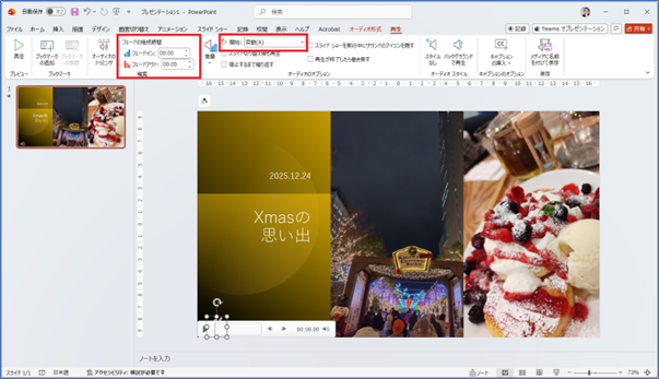 6.[フェードイン][フェードアウト]で任意の時間を指定します。