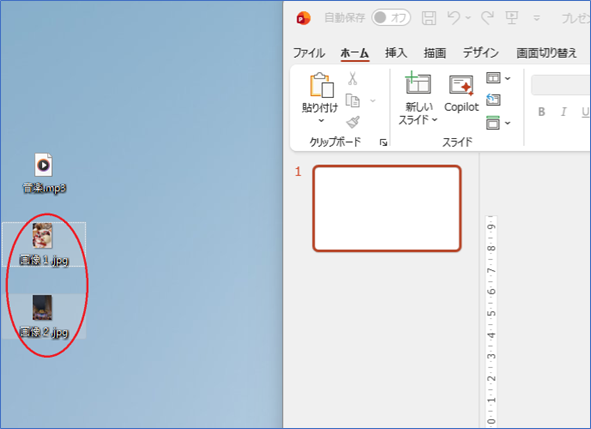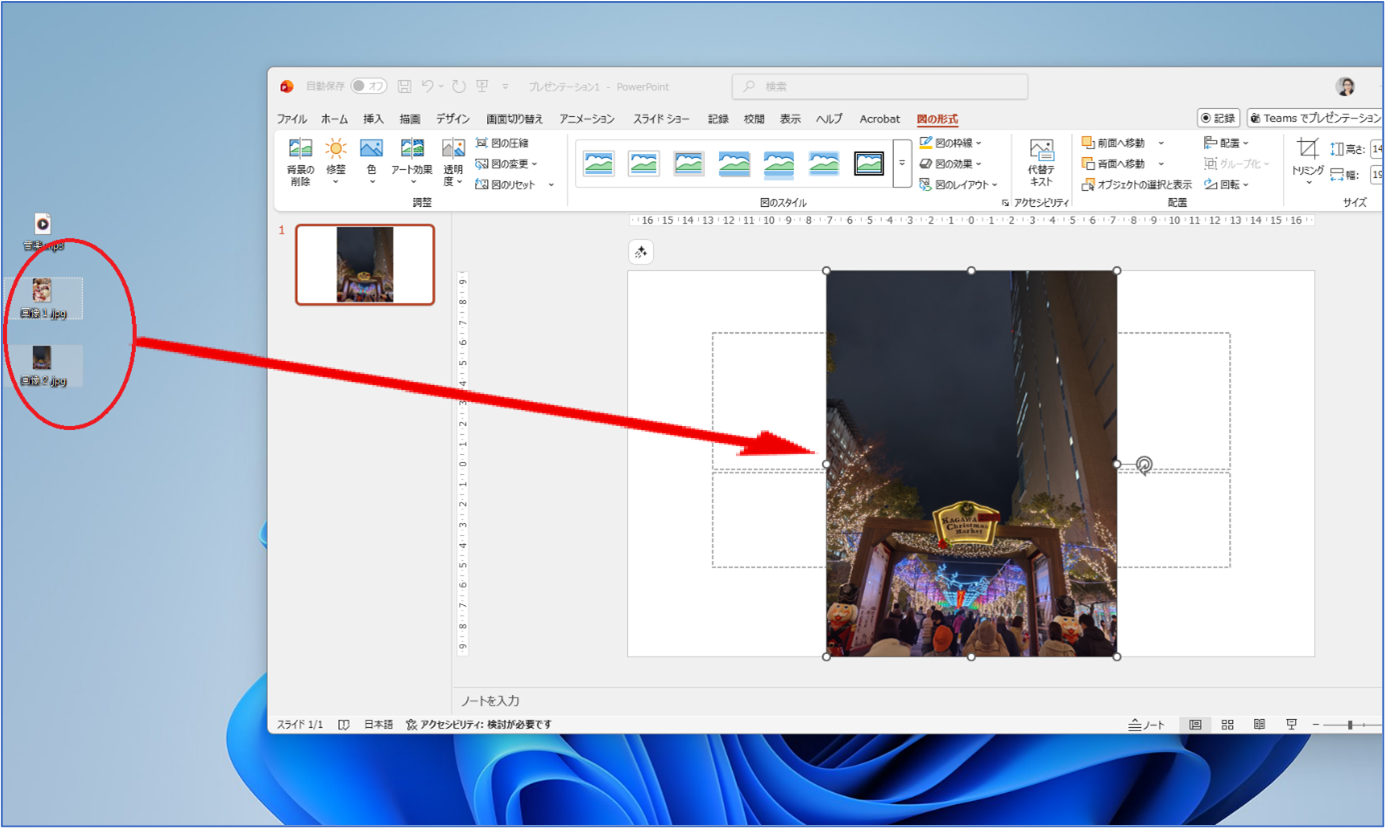 4.PowerPointのウィンドウ内へ画像ファイルをドラッグアンドドロップします