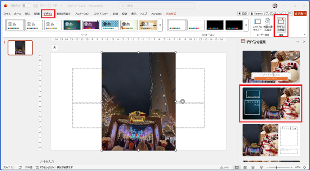 1.[デザイン]タブを選択します。2.[デザインの提案]ボタンを選択します。
