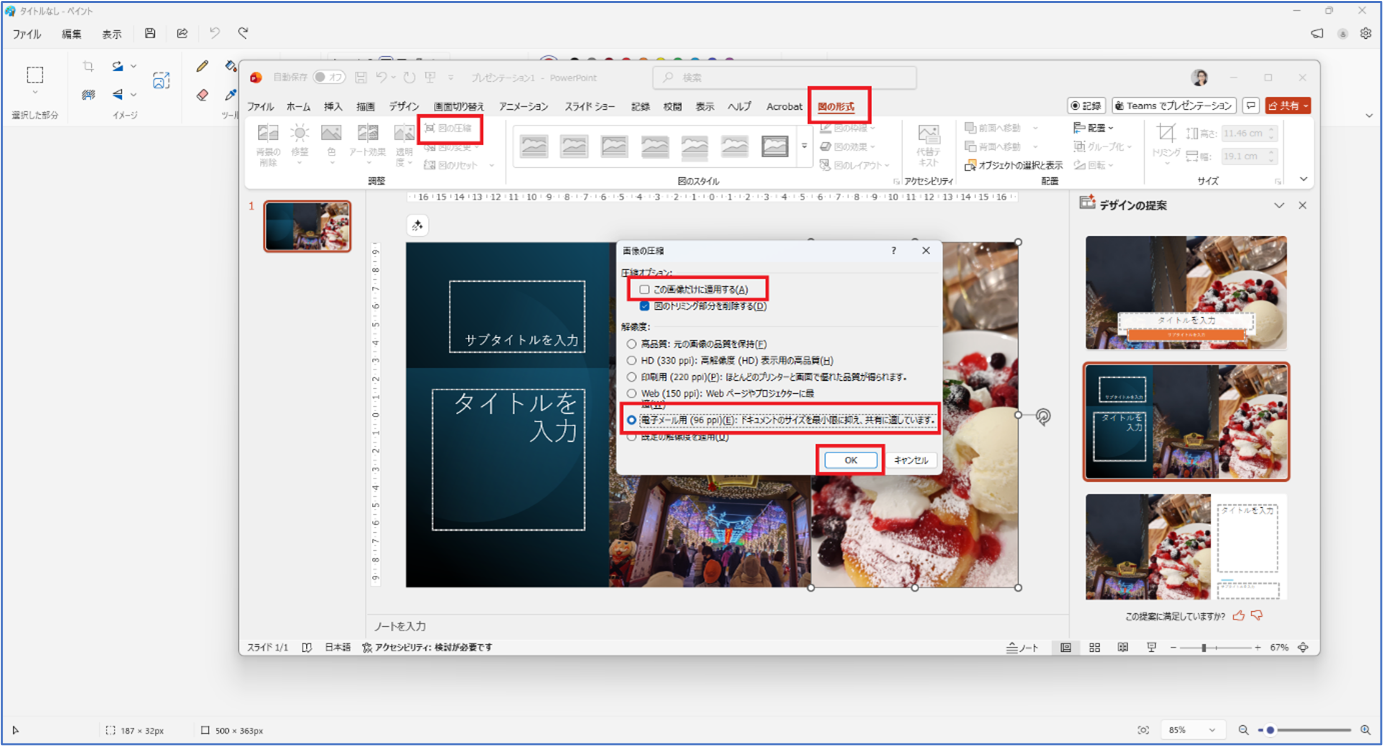 *ちなみに、わたしは年間数十本以上のプレゼンテーションをここ数十年行っていますが、電子メール用のサイズを選択して「画像が悪い」と言われたことは一度もありません。印刷用やWebページサイズの方が安心と感じる方はそちらを選択なさってください。もしも送受信のサイズが最優先の方は、電子メール用を選択しても差し支えないか、サイズを落とした後の画像を共有して関係者間で検討なさってみてください。