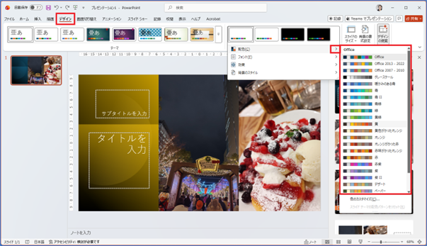 1.[デザイン]タブを選択します。2.[バリエーション]グループの▼プルダウンから配色の候補を表示します。