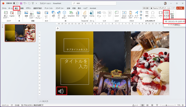 1.[挿入]タブを選択します。2.[オーディオ]ボタンの▼プルダウンを選択します。